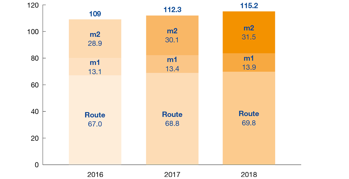 Les clientes et clients ont continué d’affluer en 2019. Nous avons transporté 122 mio de voyageurs. Globalement la croissance a été de 2.6%, ce qui représente une croissance soutenue en regard d’autres agglomérations. Le trafic régional démontre son attractivité, avec des croissances supérieures à 5% sur les lignes du Jorat. L’attractivité a été augmentée grâce à la mise en service de 13 bus à deux étages sur l’ensemble des lignes régionales. La croissance de 4.8% du m1 dépasse pour la première fois celle du m2. L’étoffement de l’offre en 2018, en heure « creuse » et « marginale », démontre une fois de plus que les lignes existantes peuvent gagner sensiblement en attractivité, lorsqu’on propose au client des horaires de « pointe » étendus sur le reste de